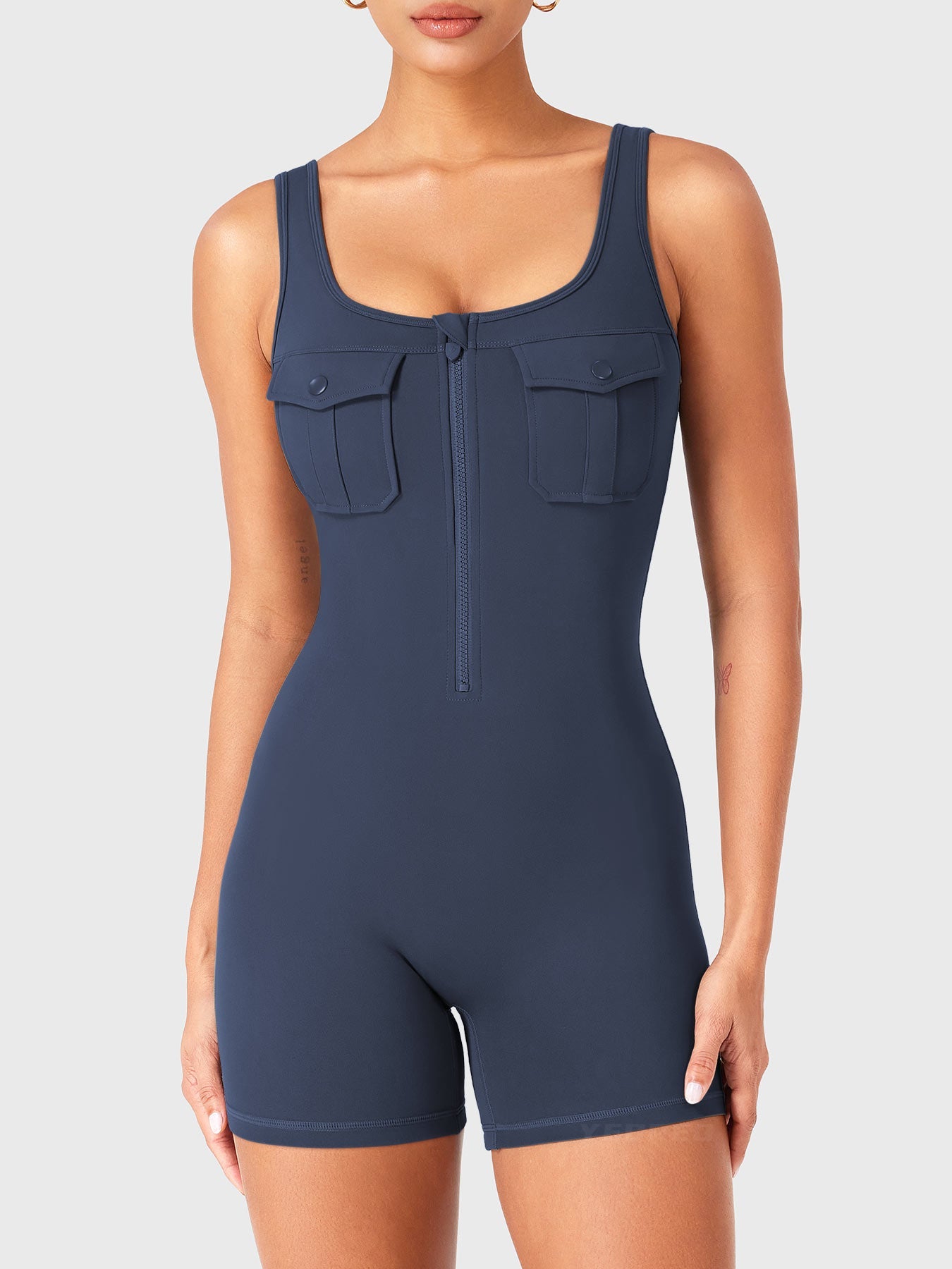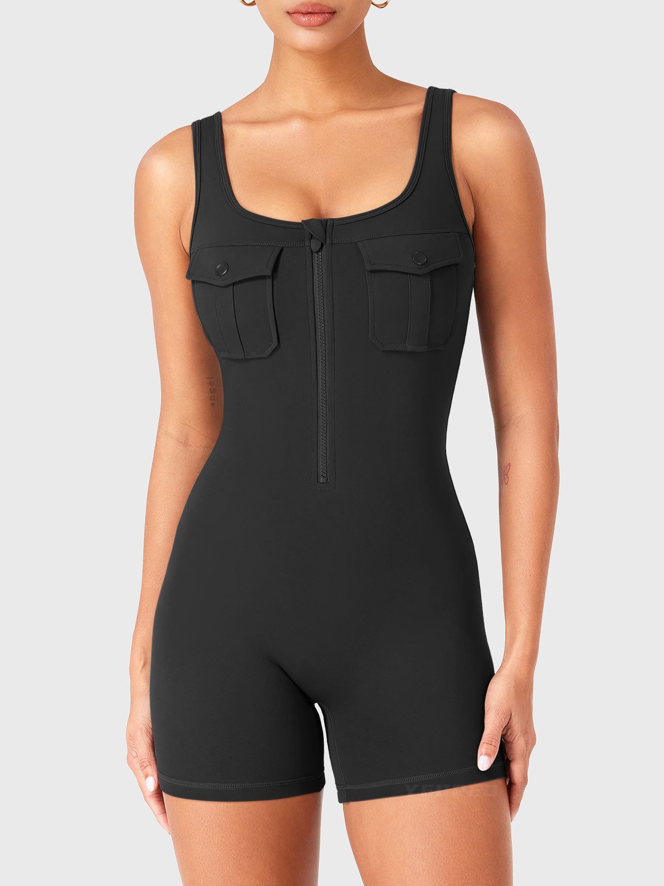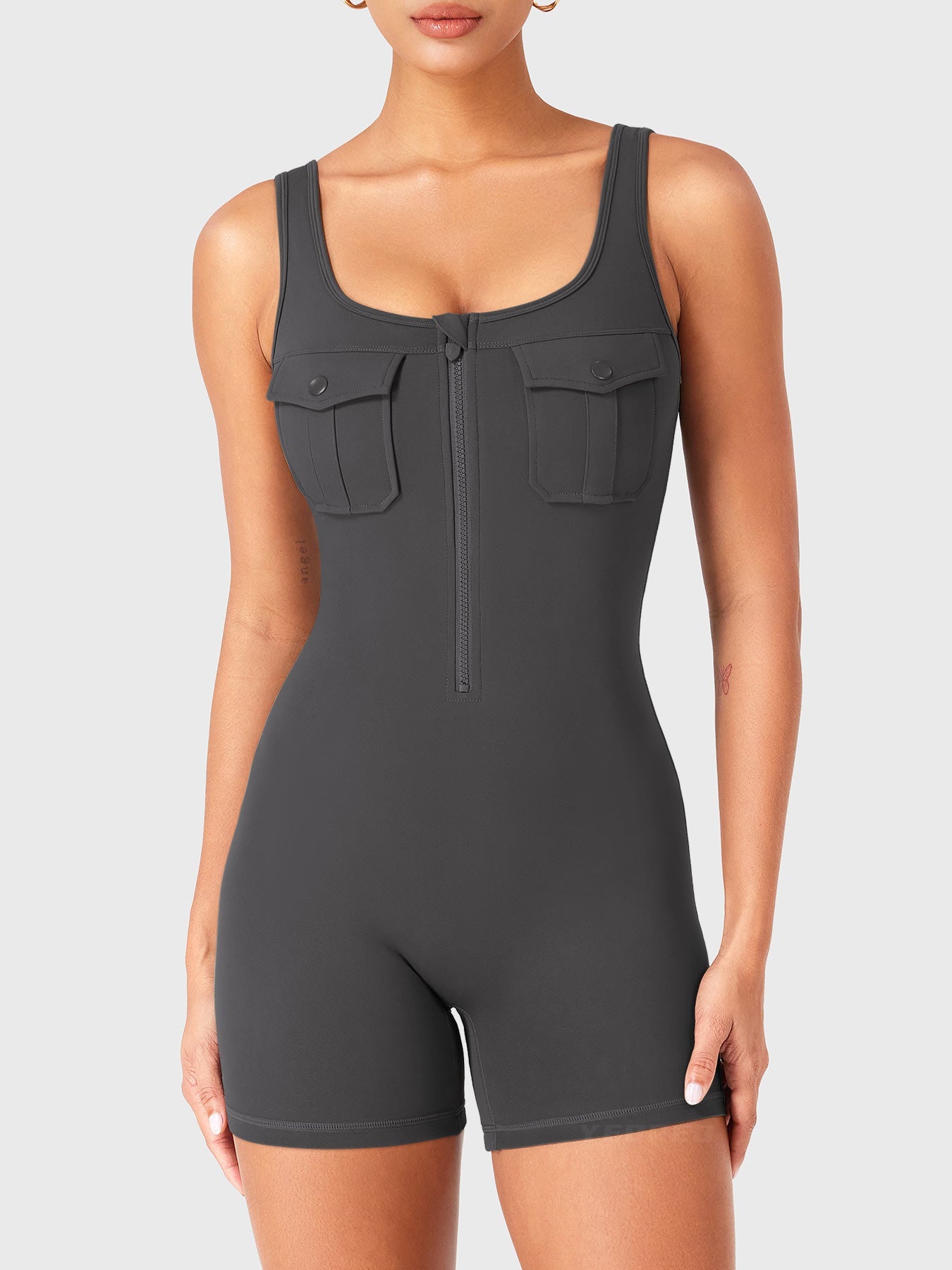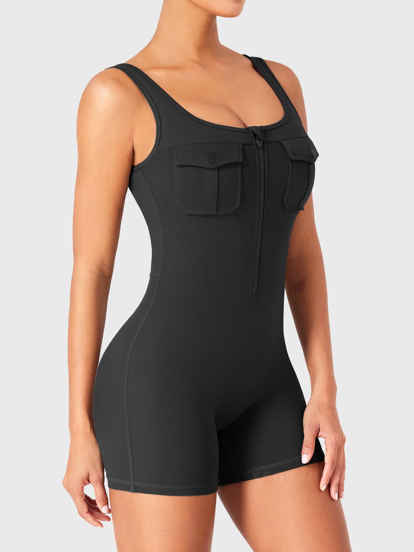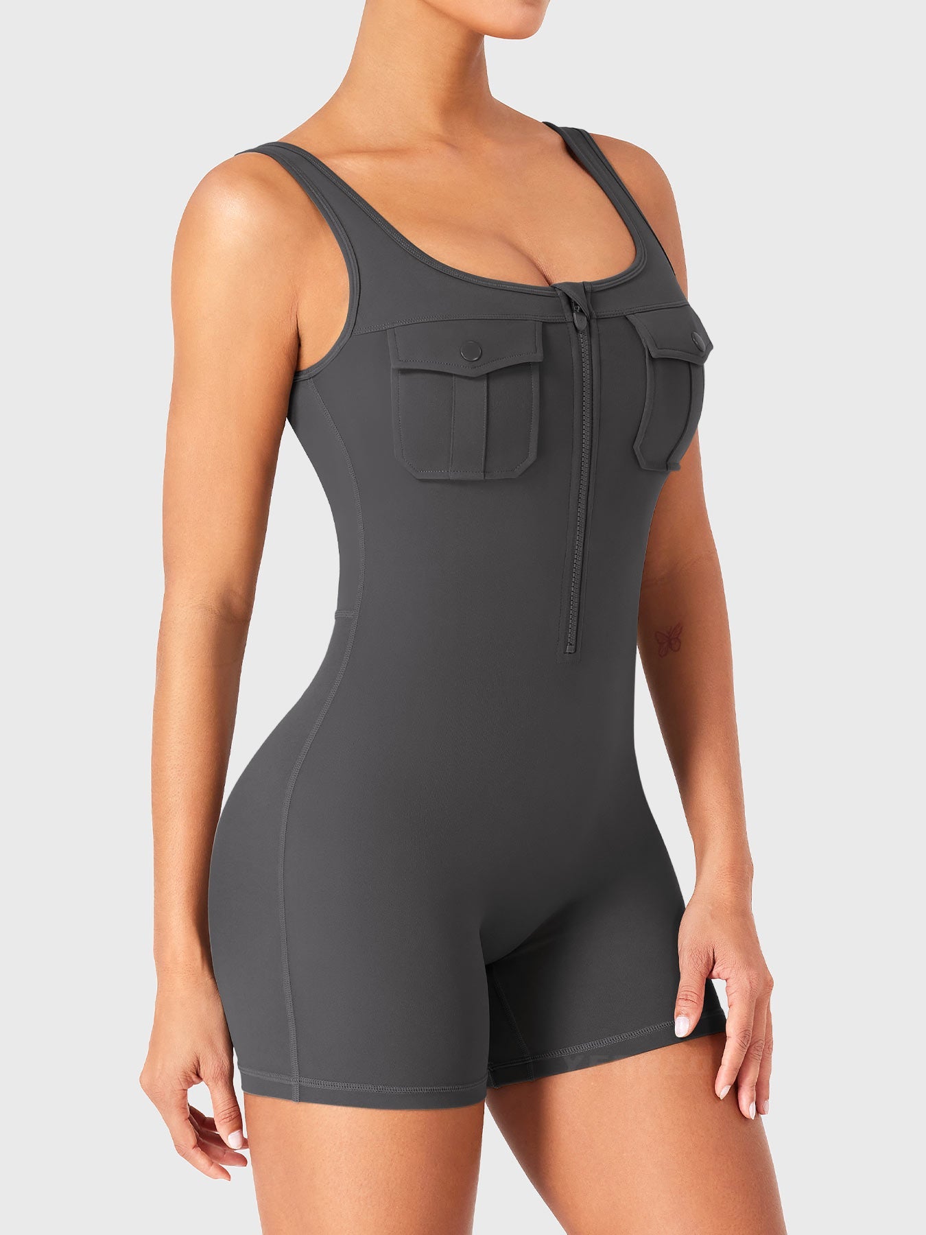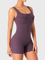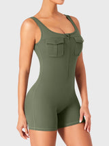 Take on the gym or the streets in the Yvonny CoreFlex Romper. Designed with a zip-front, chest cargo pocket, and a sculpting contour fit, this one-piece moves with you—from deep squats to coffee runs—no fuss, all focus.