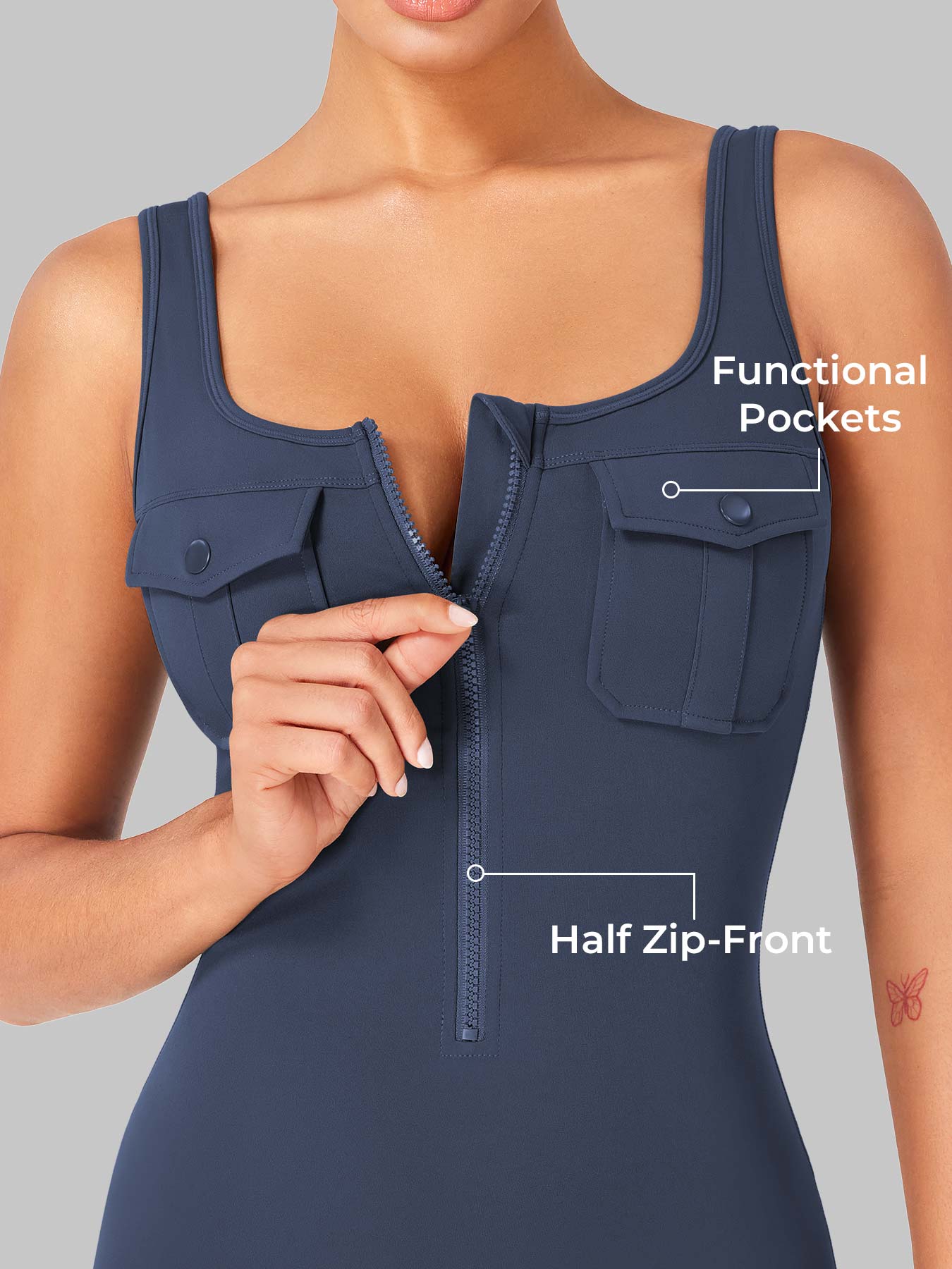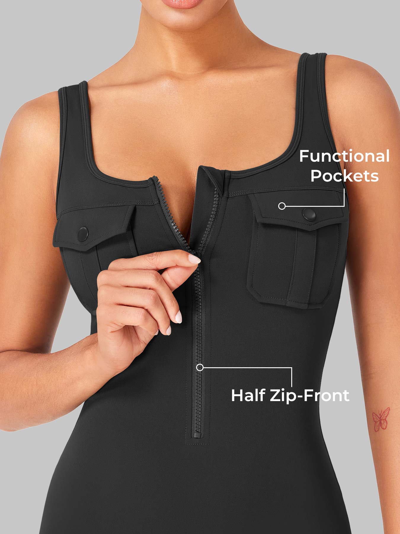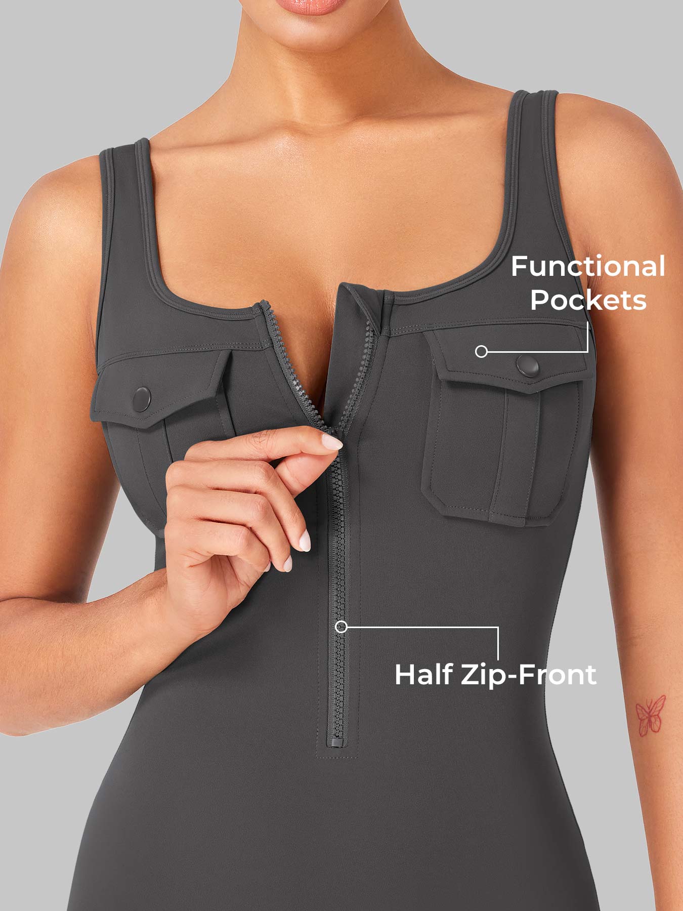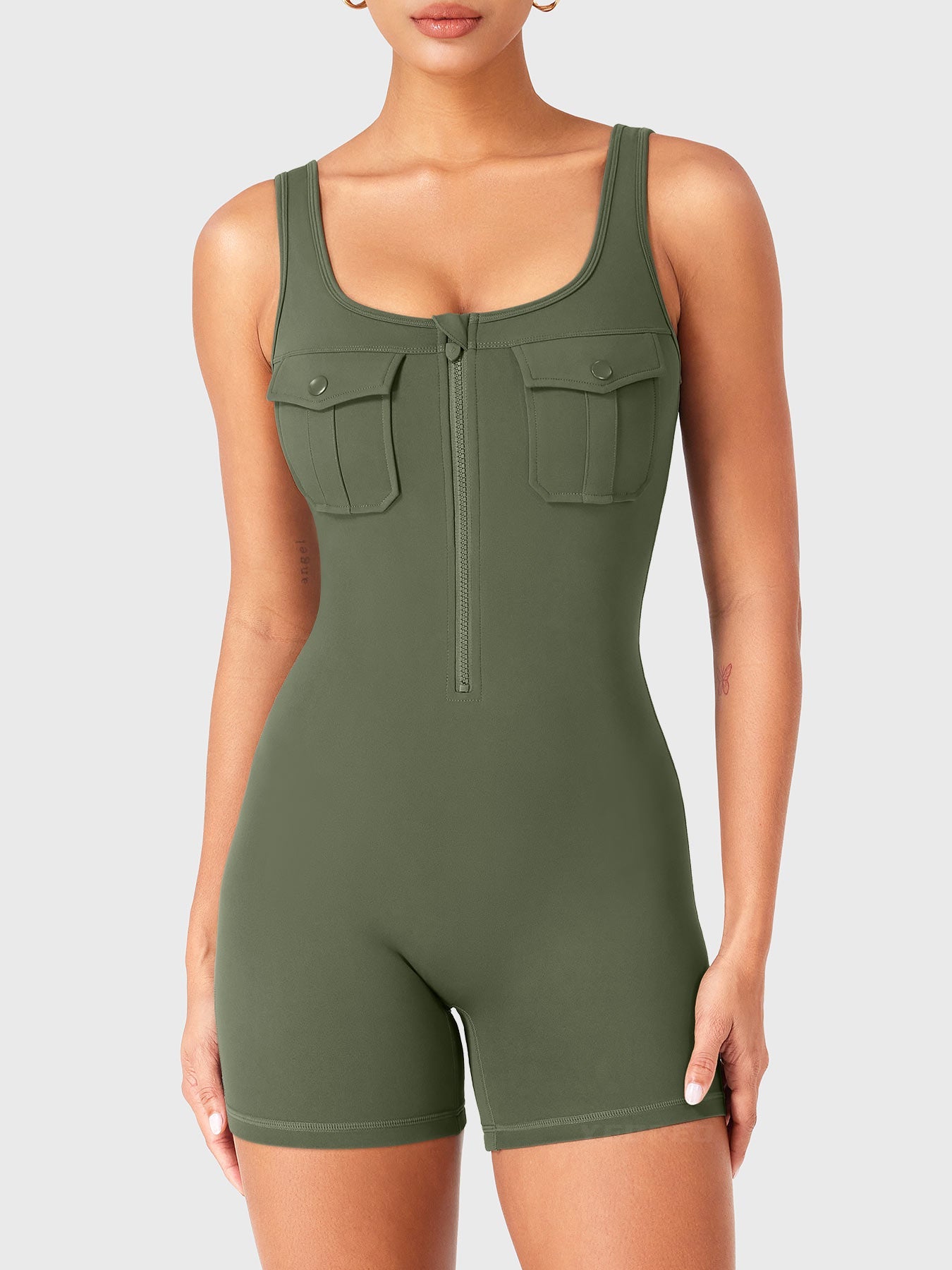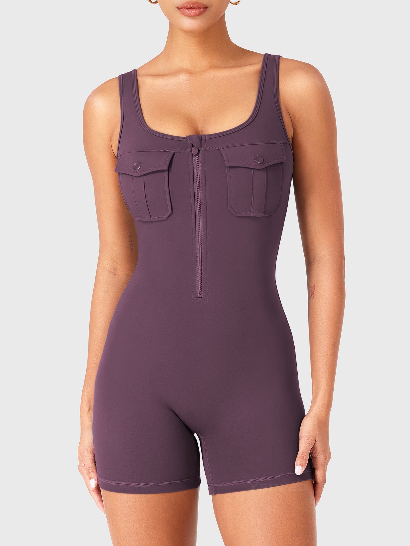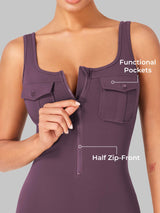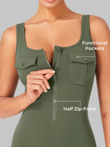Take on the gym or the streets in the Yvonny CoreFlex Romper. Designed with a zip-front, chest cargo pocket, and a sculpting contour fit, this one-piece moves with you—from deep squats to coffee runs—no fuss, all focus.